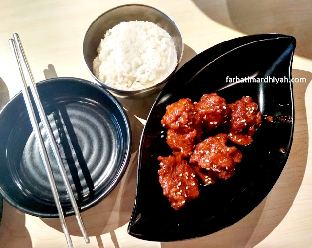 Korean fried chicken ini bukan wings tapi karage yaitu ayam tanpa tulang yang digoreng dengan balutan tepung melalui proses sekali menggoreng, lalu dibaluti lagi dengan sauce pedas yang kental dan pedas khas korea, dipercantik dengan taburan wijen diatasnya. Untuk pedasnya memang nampol banget, kalau kalian terbiasa dengan makanan khas korea tidak akan kaget rasa pedasnya yang menusuk di bibir.