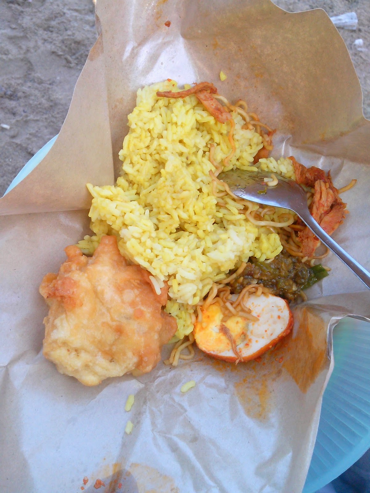 saya dan nina dapetin nasi jinggo di ujung kuta yaitu pantai legian. nah ternyata nasi jinggo ini bener kaya nasi kucing, bedanya nasi jinggo ini nasi kuning terus ada potongan telor baladonya dan mie goreng . murah cuma 3000, dan tambah gorengan plus kerupuk 5000 udah kenyang. kalo mau murah ke bali sii makannya nasi jinggo aja terus. hahaaha
