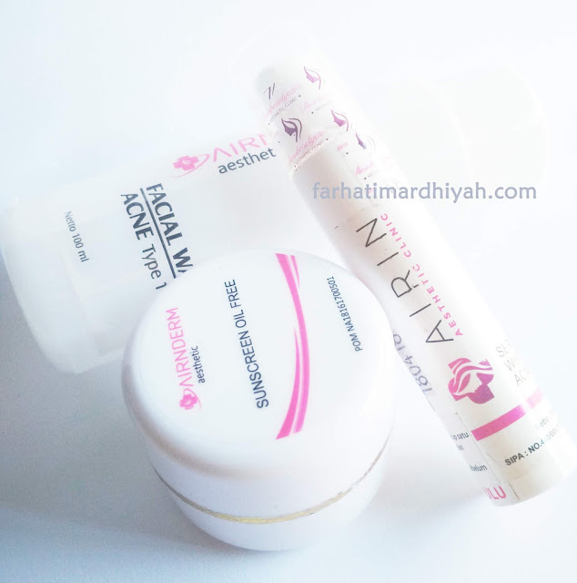 Produk Airin yang diberikan dari hasil konsultasi, karena kondisi kulitku sensitif dan sedang berjerawat jadi hanya diberikan 3 produk yaitu Sunscreen Oil Free, Serum Whitening Acne, dan Facial Wash Tipe I.