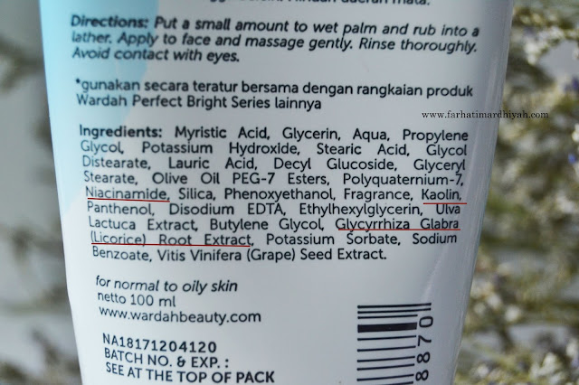 Wardah Perfect Bright Creamy Foam Brightening + Oil Control juga memberikan klaim Double Lightening Actives dan Mineral Clay. Dari ingredient-nya memang produk ini memiliki kandungan kombinasi ekstrak Licorice dan Vitamin B3, dan ada kandungan kaolin yang berperan sebagai oil absorber, jadi bisa bersih itu komedo yang ada di pori-pori wajah kita.