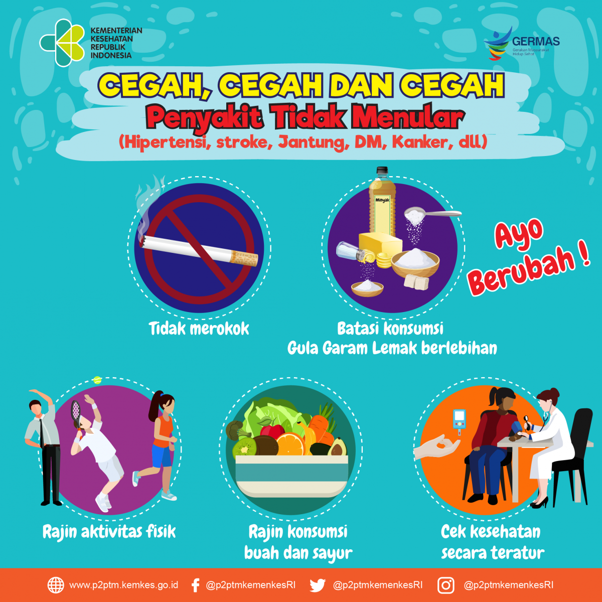 - Risiko terjadinya PTM dapat dicegah dari segala kalangan, muda sampai tua, jenis pekerjaan, status sosial, status ekonomi, desa maupun kota melalui Gerakan Masyarakat Hidup Sehat (Germas) atau gaya hidup sehat.