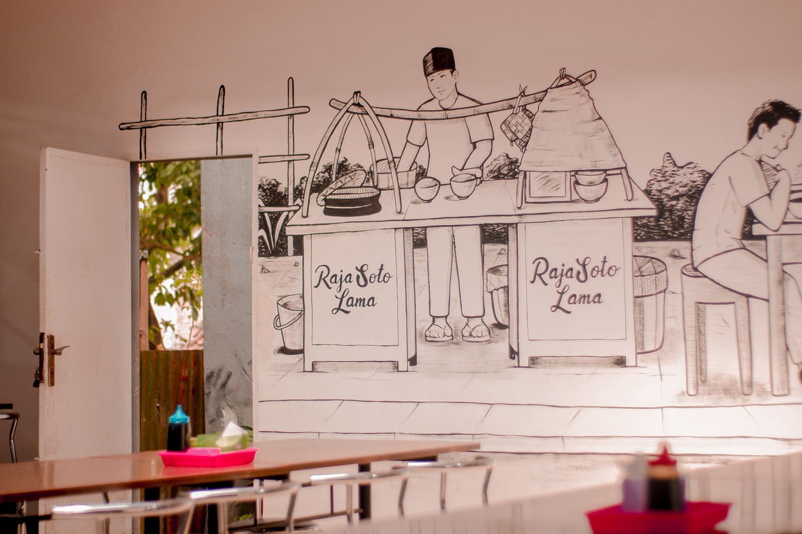Selain rasa Soto Sokaraja Raja Soto Lama yang enak, tempatnya juga super nyaman, bersih, dan rapih. Salah satu sudut tembok warung dihias dengan mural gerobak lengkap dengan penjual soto dan pembelinya.