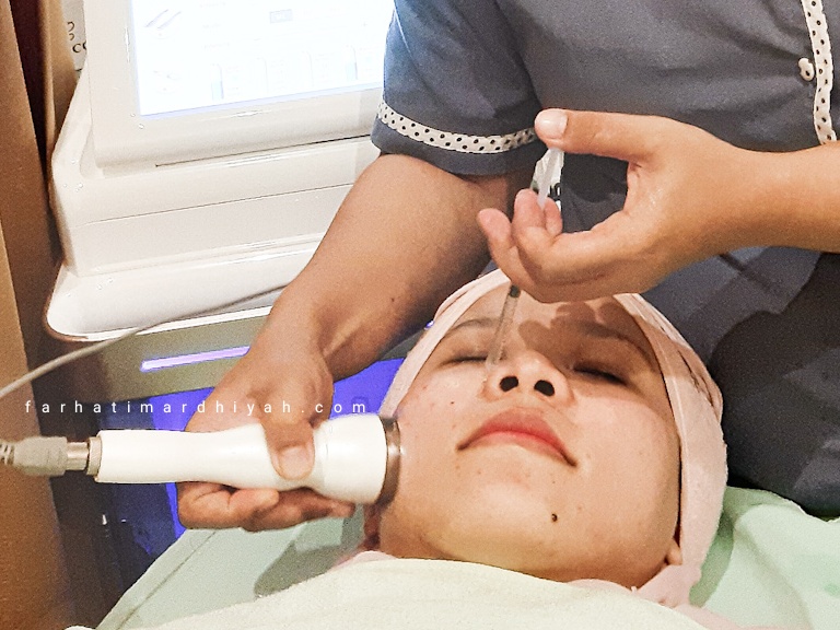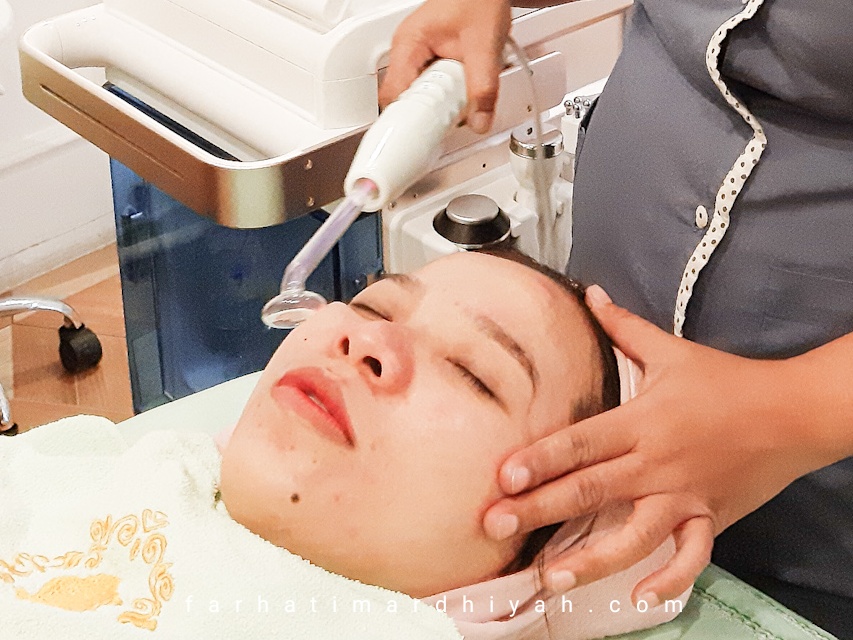 Tahap ini juga paling aku suka, karena di kulitku rasanya dingin serasa ada di Gunung, aseli gimana sih kalau kalian di gunung pasti kulit wajah tuh berasa cakep, ya kan? Nah, gitu juga dengan tahap ini kulitku disemprotkan dengan alat yang berisi Oksigen murni.
