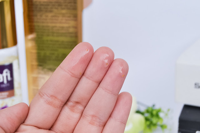 Texture dari Safi Water Essence ini cair sedikit kental tidak berwarna namun terdapat butiran emas, jangan khawatir butiran emasnya akan hilang ketika sudah diaplikasikan merata di wajah. Essence dari Safi ini cepat menyerap ke kulit, tapi tidak langsung terasa kering namun sedikit basah terasa lembab (ngerti gak yah?), dan tidak menyebabkan lebih berminyak lagi walaupun fungsinya melembabkan. Untuk wanginya menyegarkan tapi menurutku terlalu strong.
