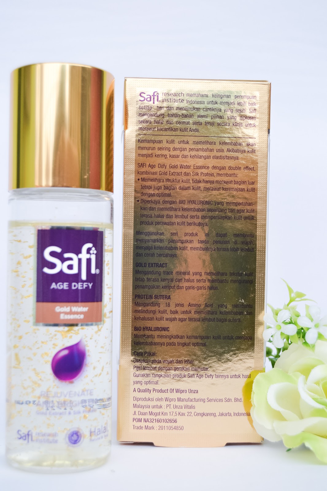 Kandungan Safi Age Defy Water Essence punya 3 kandungan utama yaitu Gold Extract, Bio Hyaluronic, dan protein sutera. Ketiga kandungan ini masing-masing jadi agent produk ini bisa bekerja di kulit kita sesuai klaim.