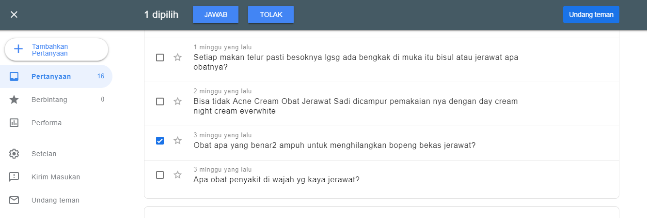 Aku sudah mencoba menggunakan Question Hub untuk menanam link artikel yang sudah aku tulis mengenai skincare untuk jerawat, karena relevan dengan salah satu pertanyaan yang tidak terjawab pada kata kunci Obat Jerawat. Setelah menanam link, aku bisa melihat performa berapa audiens yang telah mengunjungi artikelku berdasarkan pertanyaan yang aku jawab.