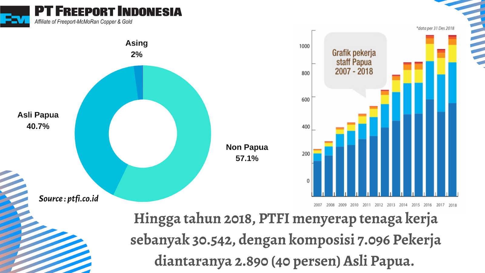 Di antara 2.890 karyawan asal Papua yang berkerja di Freeport Indonesia, terdapat 9 karyawan sebagai Vice President, dan 50 lainnya sebagai Manajer dan Karyawan Senior. Jumlah karyawan yang telah bekerja di Freeport Indonesia sampai tahun 2018 sudah mencapai 30.524, PTFI ini menciptakan lapangan pekerjaan cukup besar di Indonesia.