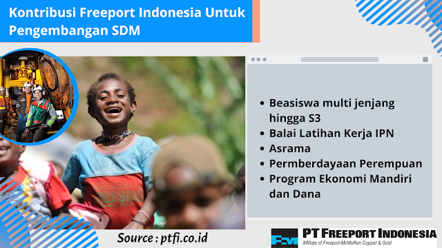 PTFI juga memiliki fokus terhadap pembangunan dan pengembangan Sumber Daya Manusia, gunanya untuk memperkarya masyarakat asli Papua menjadi lebih mandiri dan kompeten di bidang pertambangan. Bersama LPMAK, ternyata PTFI sudah memberikan beasiswa terhadap 11.000 siswa mulai tingkat SD hingga S3.