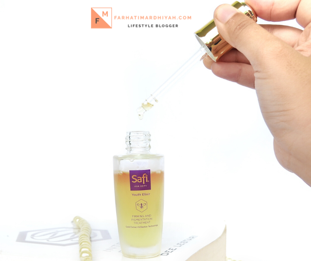 Tekstur dari Safi Age Defy Youth Elixir ini cair sedikit berminyak tapi cepat meresap di kulit wajah. Cara pakainya juga gampang, kocok dahulu agar minyak yang berwarna kuning menyatu, lalu ambil dengan pipet, aplikasikan di wajah secara merata, lalu tepuk-tepuk agar cepat meresap.