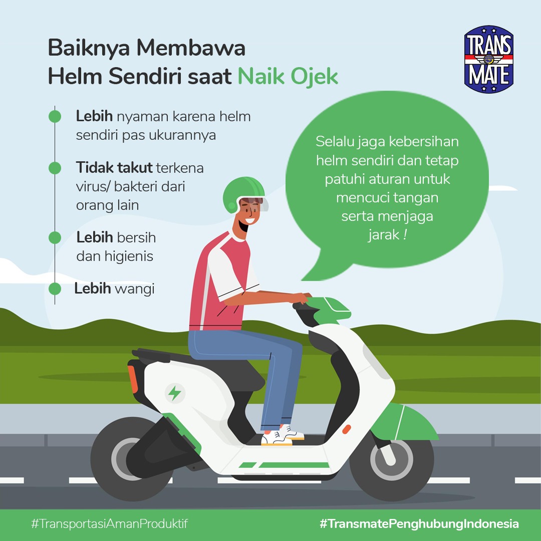 Masa Pandemi yang belum berakhir ini, wajib deh bawa helm sendiri karena bisa saja helm dari Pengemudi Online yang dipakai banyak orang menjadi penyebab penularan Virus ini, nah kan lagi-lagi kalau mau aman, disiplin kebiasaan baru ini ya!.