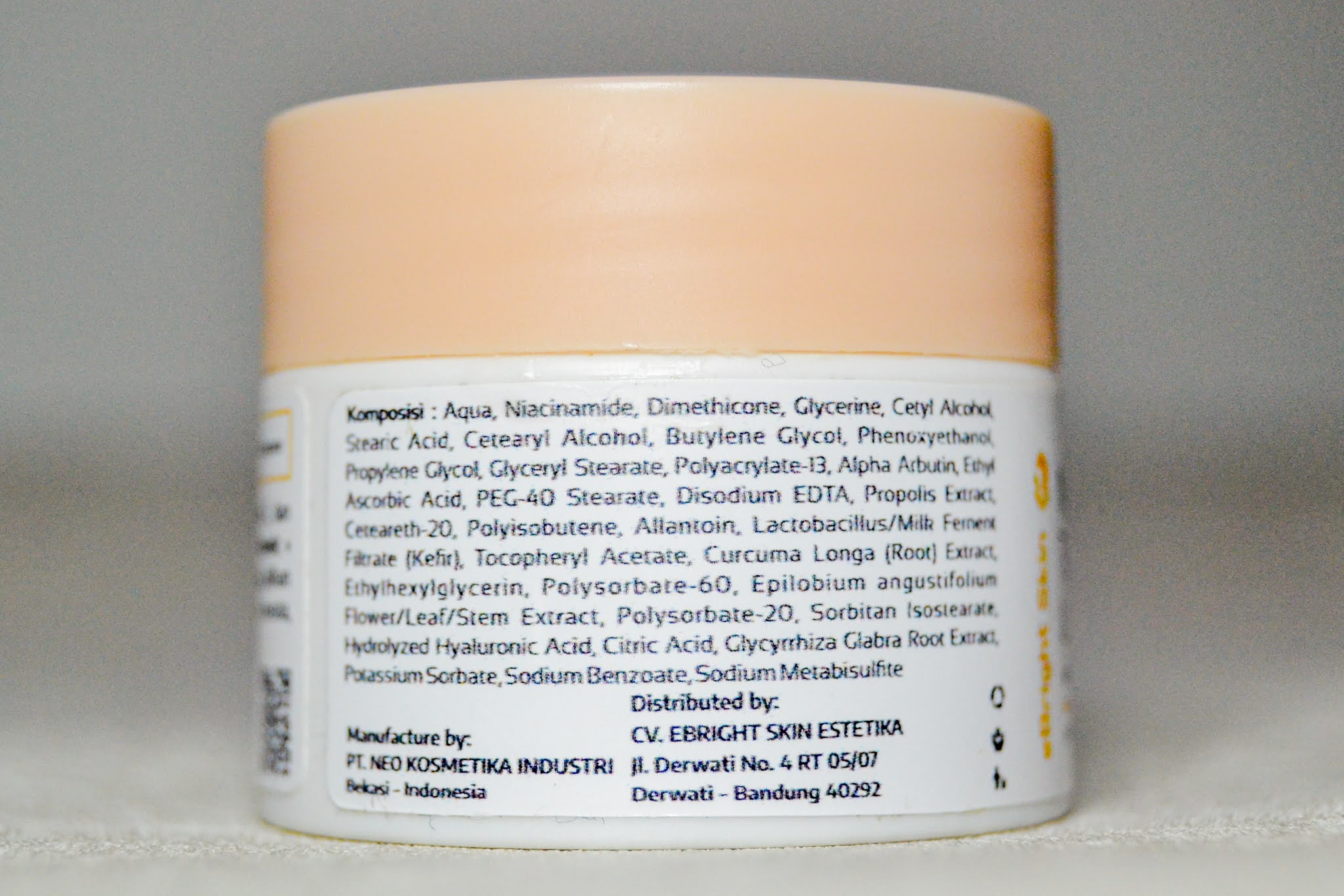 Seperti kemasan skincare lainnya, kemasan the twin cream ini sudah dilengkapi dengan informasi ingredients, klaim, produksi, sampai informasi BPOM dan keterangan Halal. Sudah dipastikan ya produk eBright Skin ini aman digunakan!