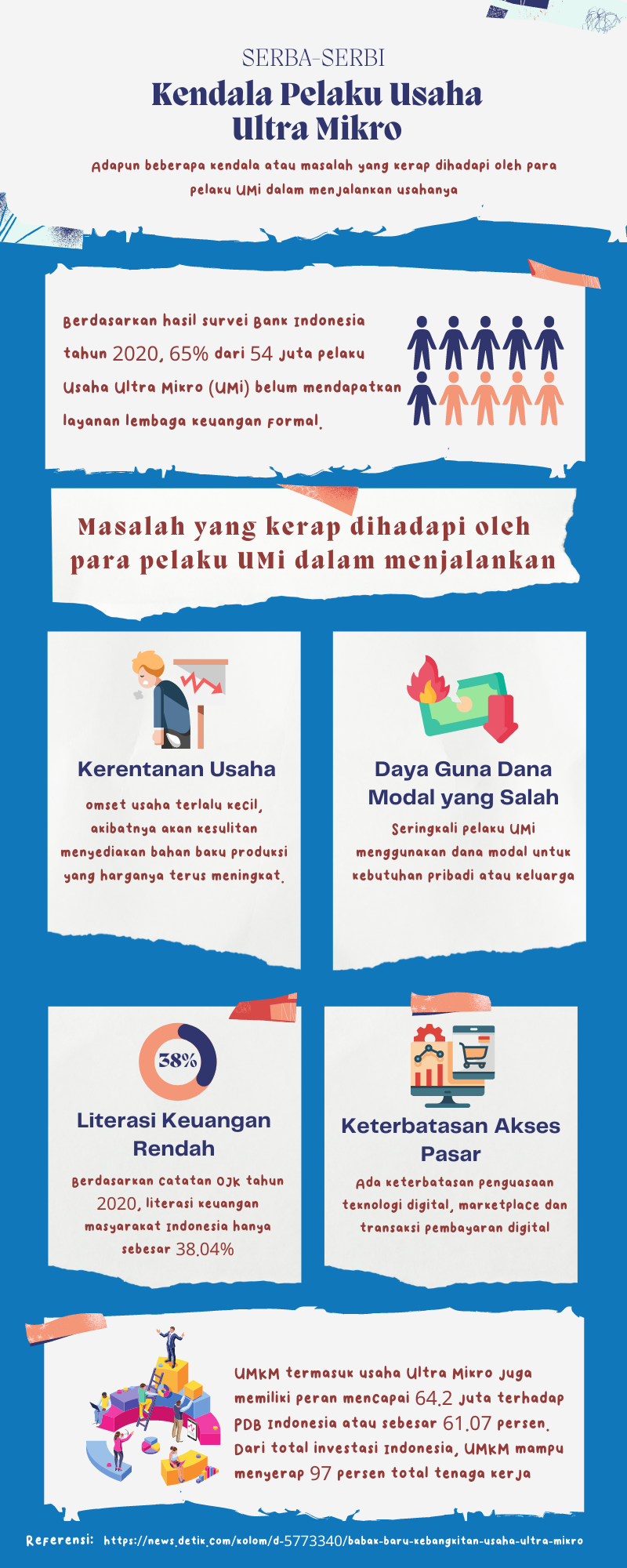 Dilansir dari detiknews, berdasarkan hasil survei Bank Indonesia tahun 2020,65 persen dari 54 juta pelaku Usaha Ultra Mikro (UMi) belum mendapatkan layanan lembaga keuangan formal. Adapun beberapa kendala atau masalah yang kerap dihadapi oleh para pelaku UMi dalam menjalankan usahanya yaitu.