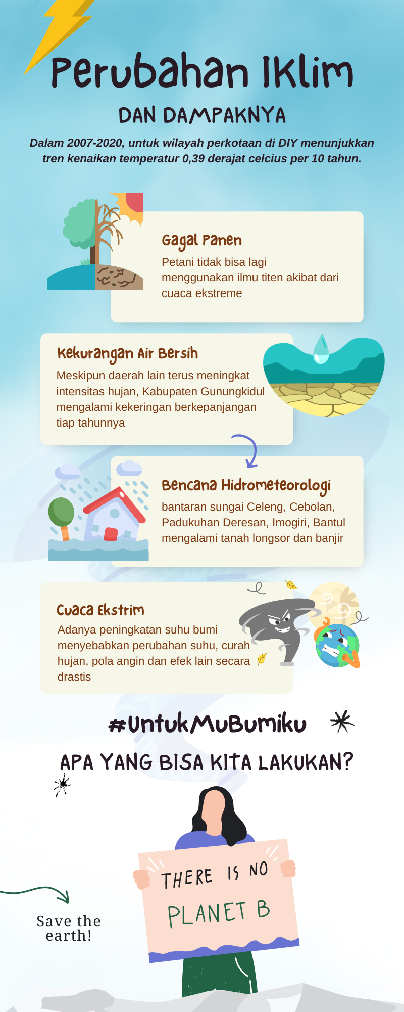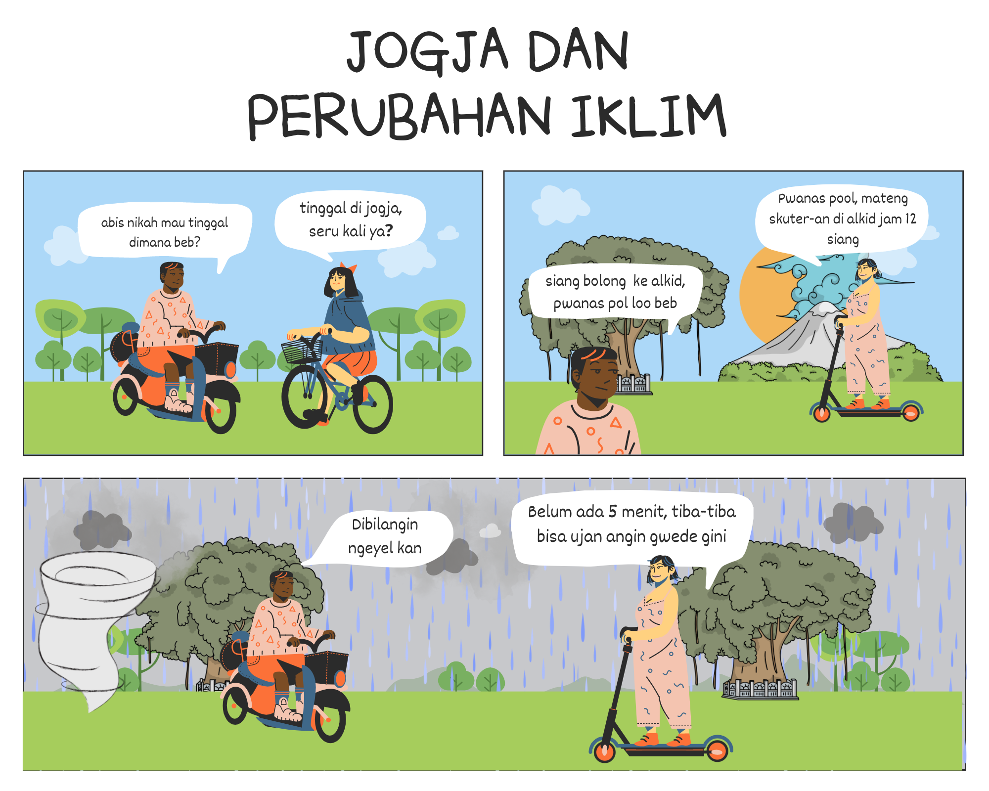 Dampak perubahan iklim seperti cuaca ekstrim sebenarnya tidak hanya dirasakan di Jogja saja, pasti kamu juga merasakan hal yang sama. Bahkan bencana hidrometeorologi seperti puting beliung, banjir, atau tanah longsor pernah terjadi di sekitar kalian.