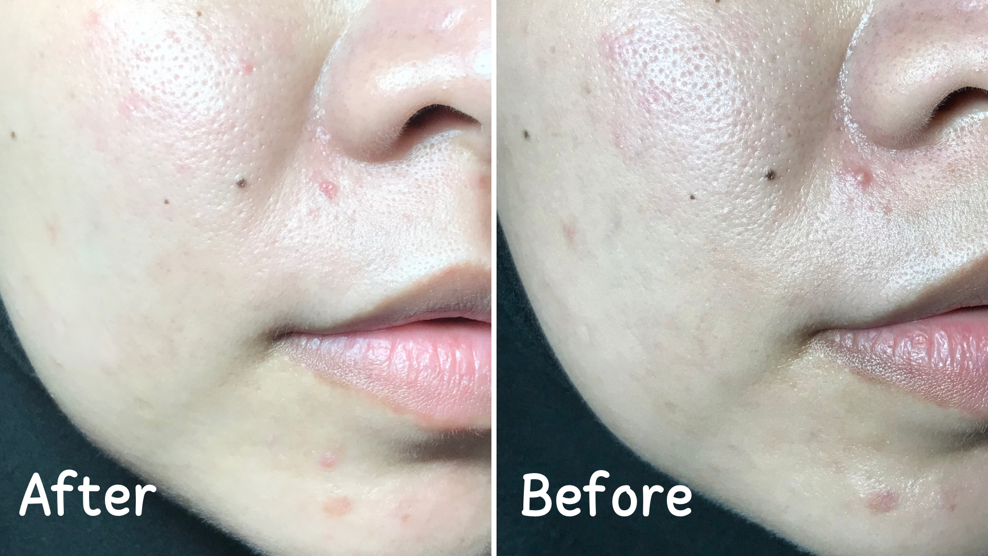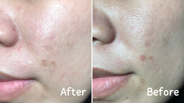 Meskipun fokus utama bahan aktif dari essence toner ini untuk merawat kulit berjerawat, ternyata bisa juga memudarkan bekas jerawat PIE. Dua spot bekas jerawat PIE di area dagu dan pipi kiri memang terlihat berbeda setelah dua minggu menggunakan essence toner.