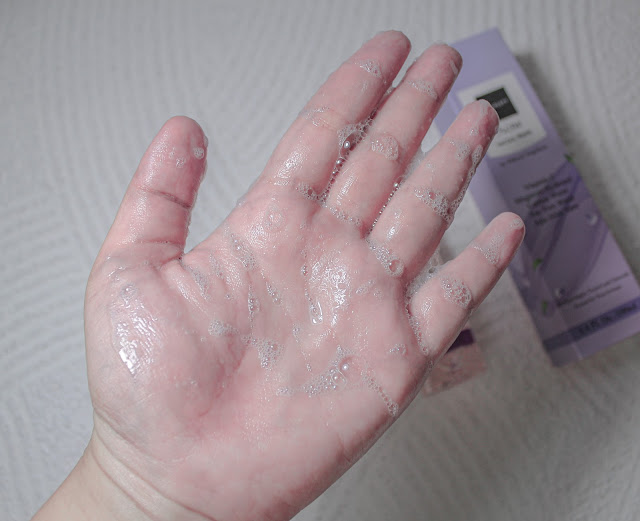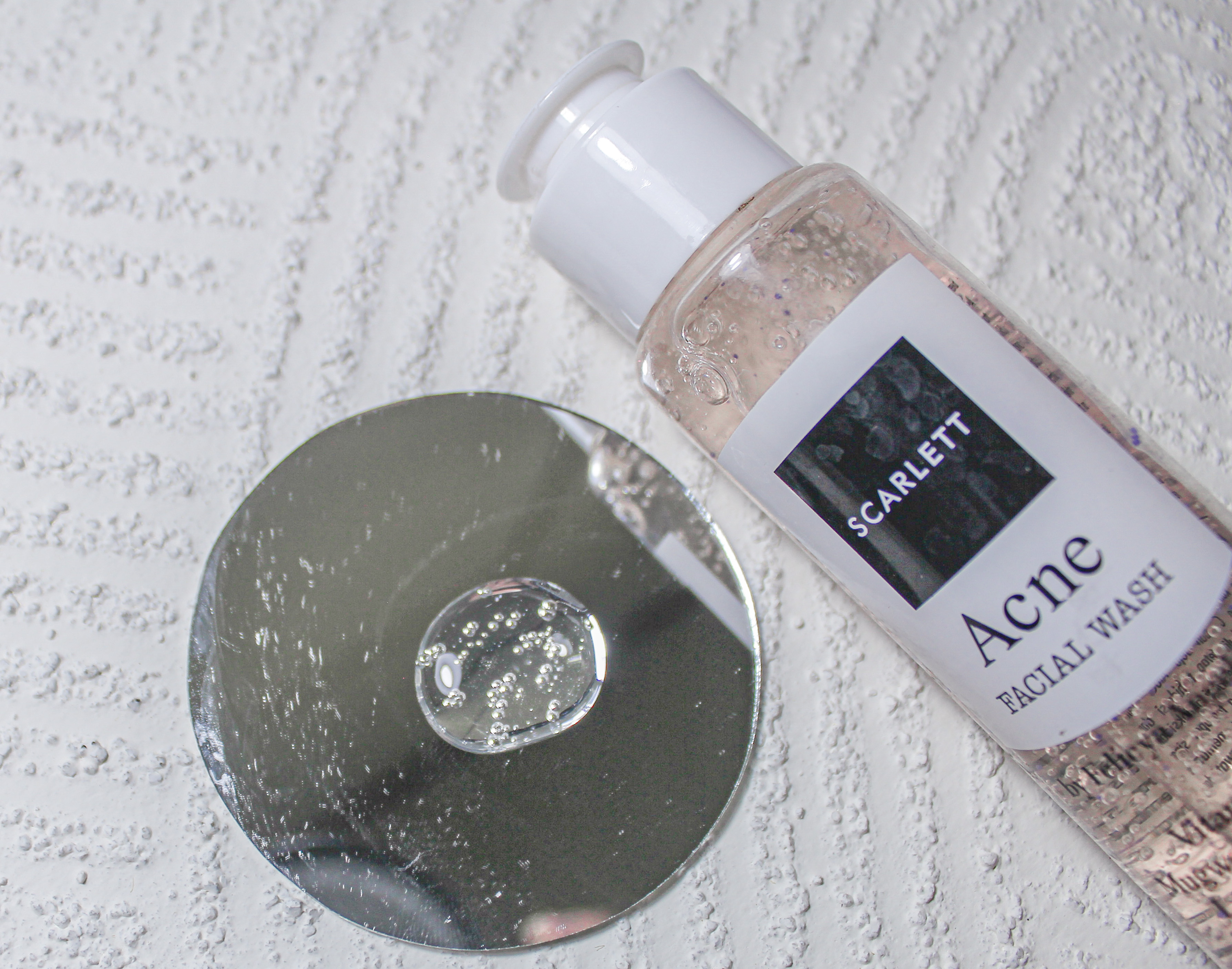 Tekstur Scarlett Acne Facial Wash sangat cair, lalu ada butiran berwarna peach. Ketika dikeluarkan dari pump, buliran tersebut mudah membaur dengan cairan tonernya.