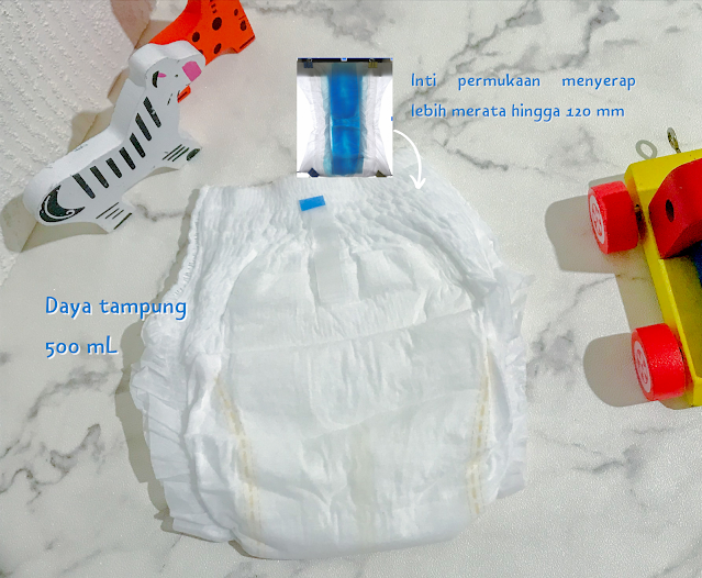 Selain itu, ketika mengganti popok tidak perlu lagi cari plastik untuk mewadahi sampah popok kotornya. Sebab, ada fitur tape pembuang yang cukup kuat perekatnya. Fitur ini tersedia pada jenis celana.
