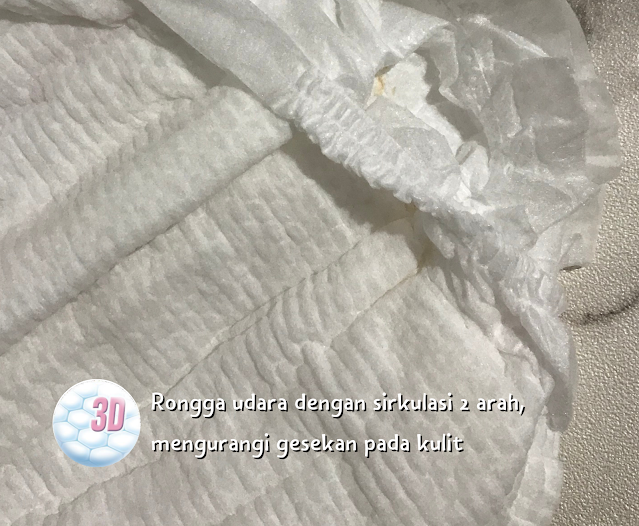 Gelembung pada karet pinggang ini juga membuat si kecil lebih nyaman. Biasanya kan, kalau terlalu lama pakai diapers akan muncul bekas karet yang memberikan efek gatal.