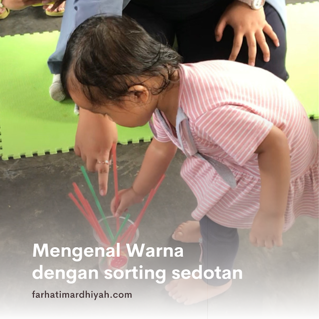 Selanjutnya, anak-anak diajak "mengenal warna" dengan cara memindahkan sedotan ke tempat masing-masing yang disediakan. Disini snak-anak terlihat excited, karena harus berlari kecil dari tempat mengambil sedotan ke gelas warna-warni.
