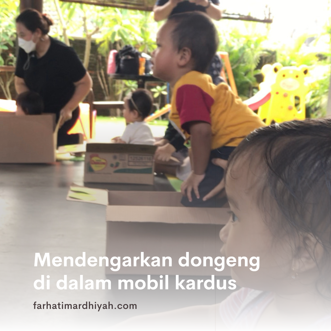 Untuk anakku, malah menikmati naik kardus dan main tempelan warna-warni yang dibuat seperti lampu mobil. Sesekali, melihat dan mendengarkan gerakan boneka tangan yang diperagakan Miss-nya.