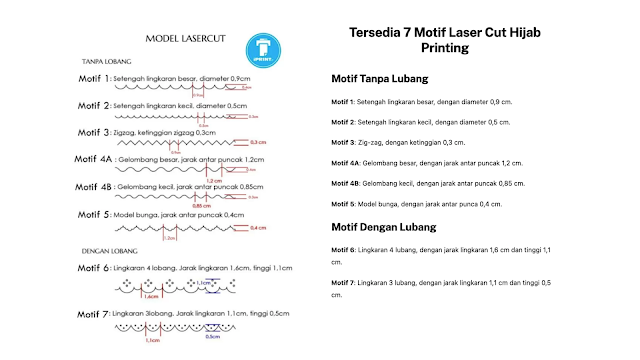 Selain itu, kita juga bisa menentukan motif laser cut hijab printing. iPrint menyediakan 7 motif yang bisa disesuaikan kebutuhannya dengan permintaan customer.