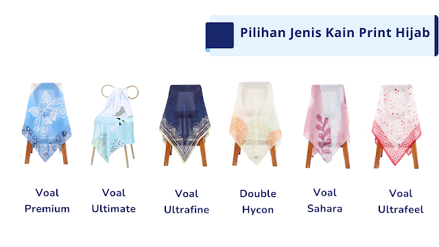 Untuk print hijab, iPrint menyediakan 7 pilihan bahan dari 6 jenis kain. Model hijab bisa ditentukan sesuai keinginan, bisa segi empat atau hijab square, hijab syar'i, pasmina, scarf, bergo, khimar, dan masih banyak lagi.