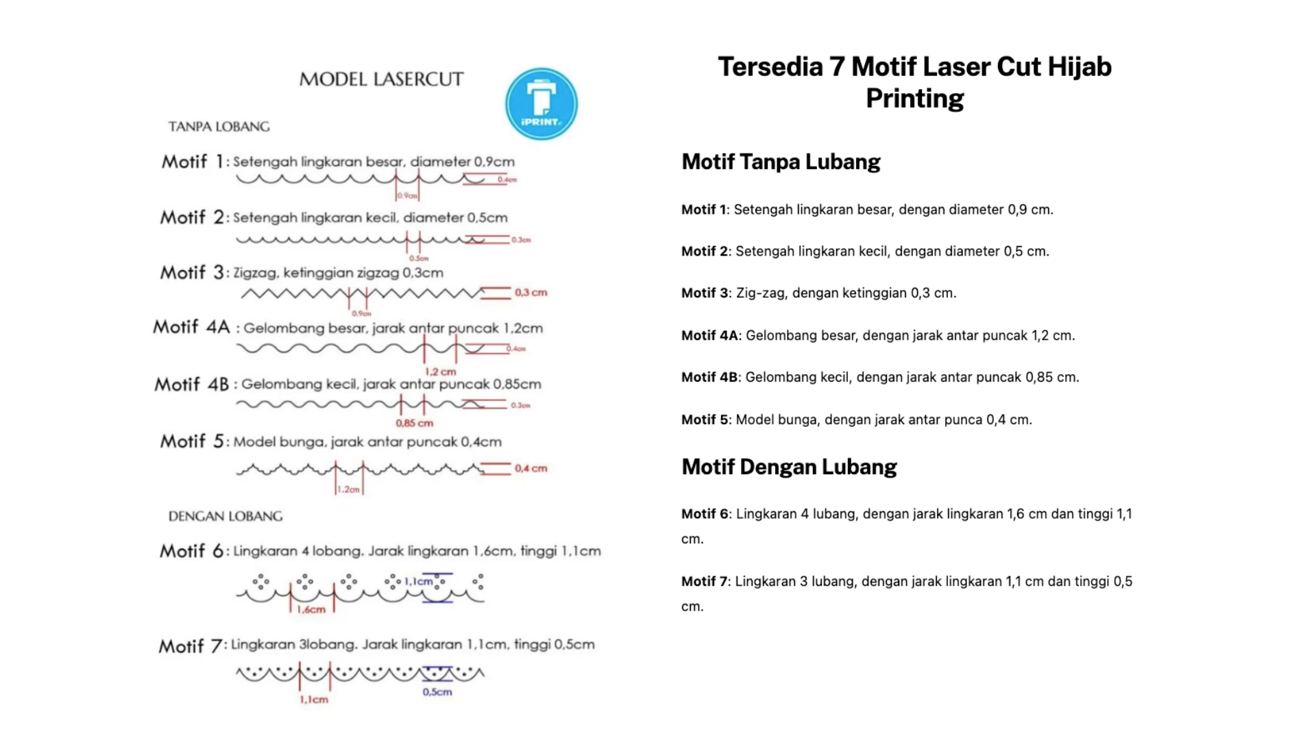 Selain itu, kita juga bisa menentukan motif laser cut hijab printing. iPrint menyediakan 7 motif yang bisa disesuaikan kebutuhannya dengan permintaan customer.