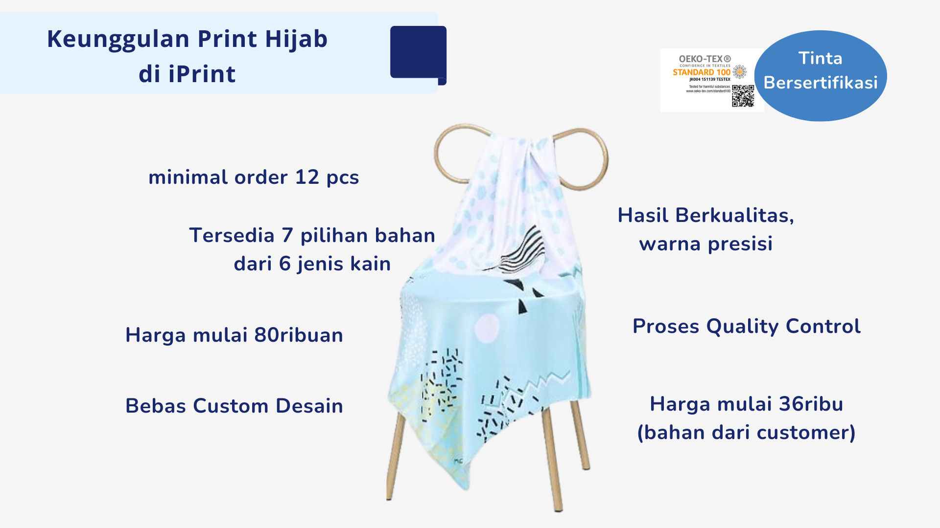 Untuk print hijab, iPrint menyediakan 7 pilihan bahan dari 6 jenis kain. Model hijab bisa ditentukan sesuai keinginan, bisa segi empat atau hijab square, hijab syar'i, pasmina, scarf, bergo, khimar, dan masih banyak lagi.