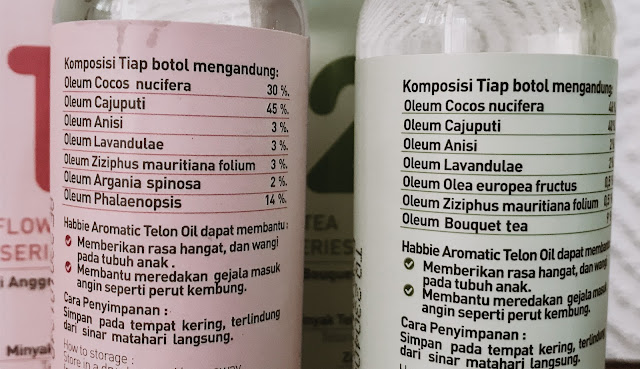 Aromatic dari telon Habbie berasal dari campuran essential oil didalamnya. Bukan pewangi sintetik ya, jadi aman sekali untuk bayi dan bisa berfungsi menggantikan peran parfum. Contohnya, ada sakura oil, berbagai tea oil, petuna oil, dan lainnya.