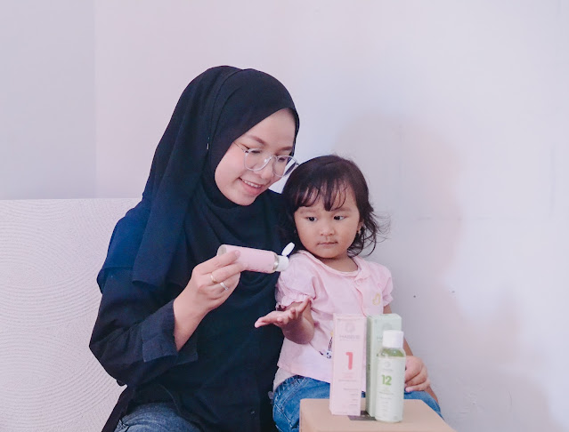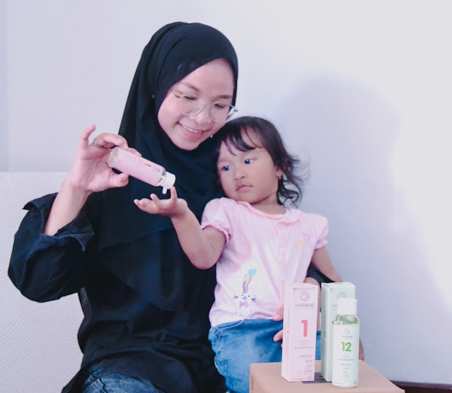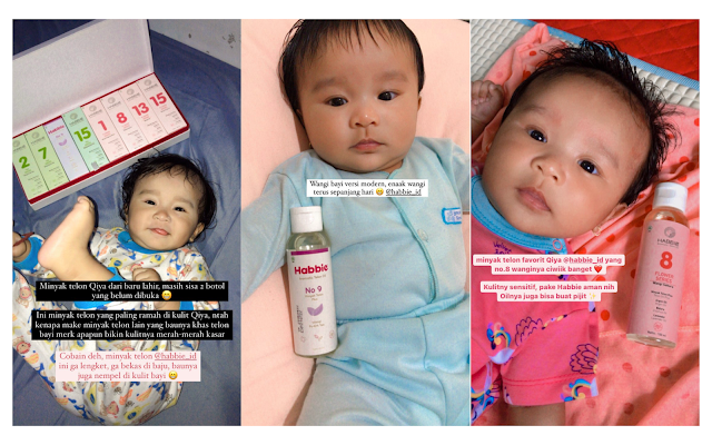 Saya pun jatuh cinta pertama kalinya saat mengunakan minyak telon Habbie pada Qiya. Variannya ada aroma tea series dan flower series, wanginya beneran nempel seharian jadi membuat saya makin sering memeluk Qiya.