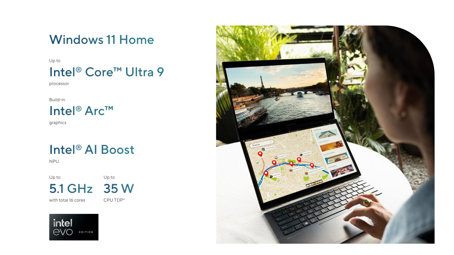 Performa mesin dari laptop dua layar Zenbook DUO ini ciamik banget sih, powerful dan gesit. Tenaganya pakai prosesor bertenaga AI generasi Intel terbaru, Intel® Core™ Ultra 7 155H yang sudah bersertifikat Intel® Evo™ Edition. Prosesornya ini sudah terintegrasi juga dengan NPU (Neural Processing Unit) yang membuat laptop lebih gesit, hemat baterai, dan lebih pintar dalam menggunakan aplikasi berbasi AI.
