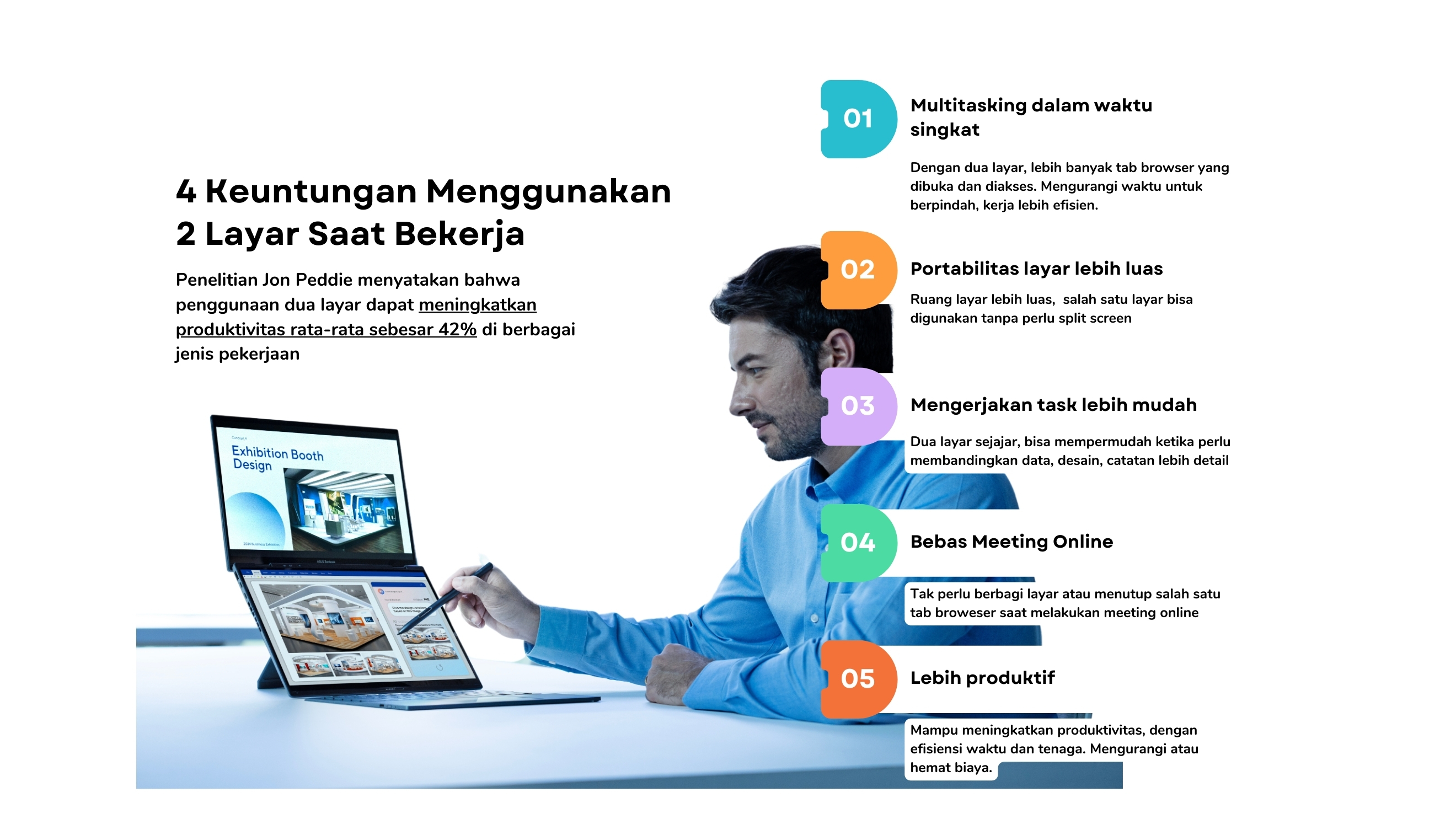 Kebutuhan device yang kami cari bukan hanya laptop mewah dan canggih. Laptop yang bisa meningkatkan kemampuan multitasking hingga bisa membuat kerja lebih efisien dan produktif. Itulah yang ditemukan pada laptop dua layar terbaik ASUS Zenbook DUO (UX8406).