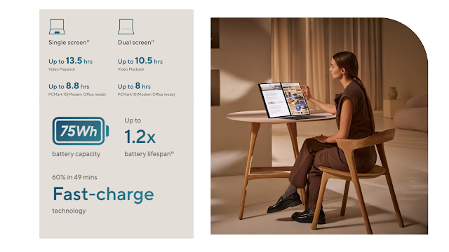 Tenang, racikan laptop Zenbook DUO sudah digodok matang. Baterai laptop Zenbook DUO memiliki kapasitasi tinggi 75Wh dilengkapi dengan teknologi fast charging. Bekerja pun bisa lebih nyaman dan produktif hingga 8 jam. Gak khawatir baterai habis, pengisian daya jauh lebih cepat hanya butuh 40% bisa mengisi baterai hingga 60%.