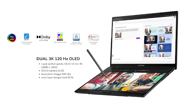 Kedua layarnya pun punya resolusi 3K 2880x1800 pixel, dengan lebar rasio 16:10, refresh rate 120Hz, peak brightness 500 nits. Apalagi diberikan kenyamanan visual dengan reproduksi warna terbaik dan akurat. Pasalnya, kedua layar Zenbook DUO mengusung panel teknologi ASUS Lumina OLED tersertifikasi Dolby Vision®, Pantone® Validated, memiliki color gamut 100% DCI-P3, dan VESA Display HDR™ True Black 500.